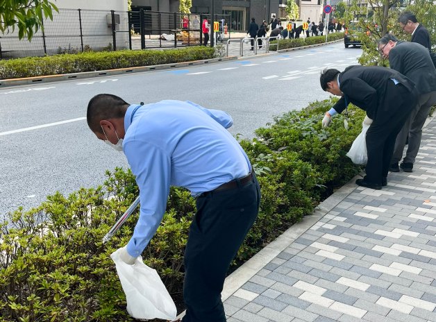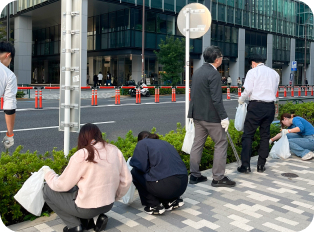 リンクスクエア新宿周辺のゴミ拾い活動に社員が参加し、地域の一員として環境美化に貢献しています。快適で安全な都市環境づくりをサポートします。