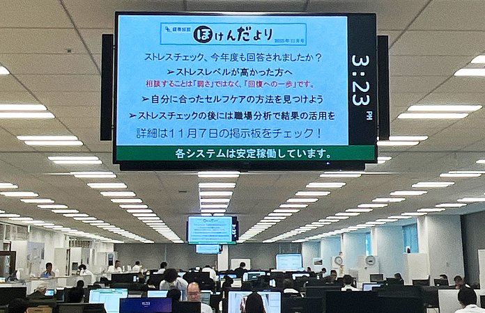 衛生委員会や社内ポータル、デジタルサイネージを通じて健康情報を社内発信しています。