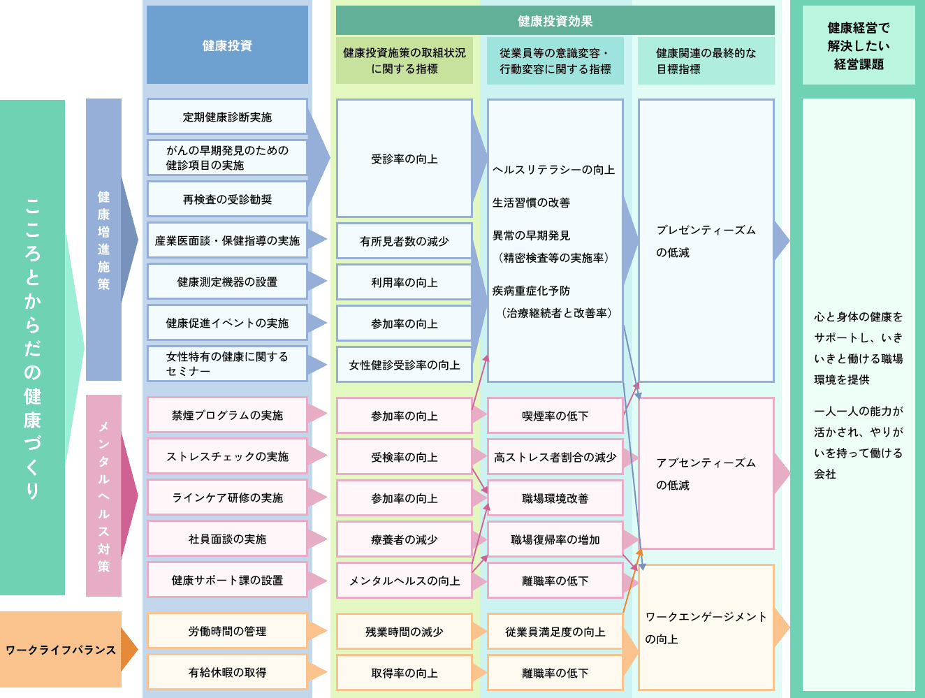 「健康経営」とは、従業員の健康維持・促進を経営的な視点から捉え、戦略的に取り組む経営手法です。「お互いを尊重し、健康で活力ある企業として前進します。」という当社の基本理念にもとづき、従業員の健康をサポートすることで、一人ひとりの活力や生産性の向上、ひいては会社全体の業績・価値向上を目指します。